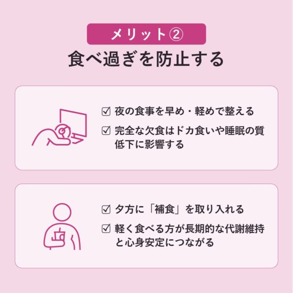 夜の食事を早め・軽めに整えることで、お菓子などの過食や間食の抑制につながる。強い空腹状態はコルチゾールなどのストレスホルモンを高め、ドカ食いや睡眠の質低下を引き起こすため、完全な欠食は避けたい。