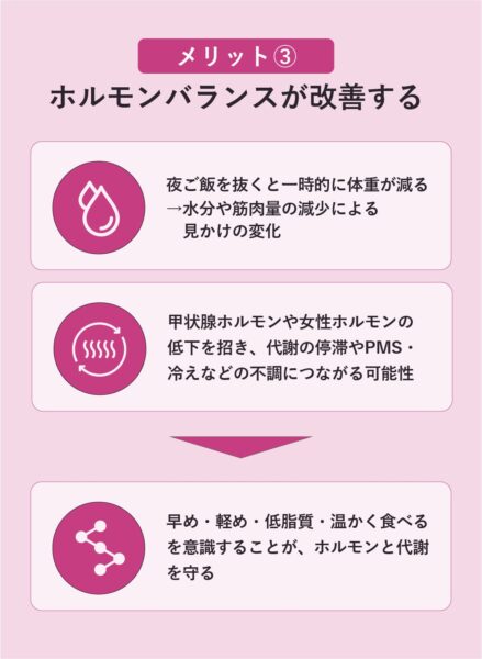 夜ごはんを抜くと、一時的に体重が減るものの、それは水分や筋肉量の減少による見かけの変化にすぎない。長期的には甲状腺ホルモンや女性ホルモンの低下を招き、代謝の停滞やPMS・冷えなどの不調につながる。