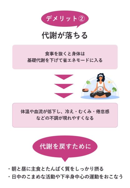 とくに夜抜きはたんぱく質・鉄・亜鉛・ビタミンB群の摂取機会を失い、ホルモン分泌や免疫機能にも悪影響を及ぼす。代謝の回復には、朝と昼に主食(糖質)とたんぱく質をしっかり摂ること、そして日中のこまめな活動や下半身中心の運動をおこなうことが重要。