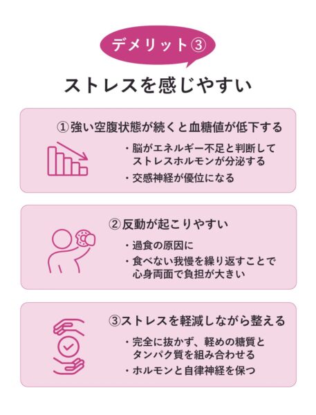 強い空腹状態が続くと血糖値が低下し、脳がエネルギー不足と判断してストレスホルモンのコルチゾールを分泌する。これにより交感神経が優位となり、イライラや集中力の低下、睡眠の質の悪化を招く。