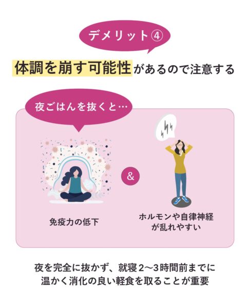 夜を完全に抜くと、代謝・免疫・ホルモン分泌が低下しやすく、冷え・便秘・疲労感・肌荒れなど「内臓力の低下」につながります。どうしても食べすぎた翌日は、主食を軽くする・具だくさん味噌汁+豆腐などで内臓を休めるといった“整える夜”に変えましょう。