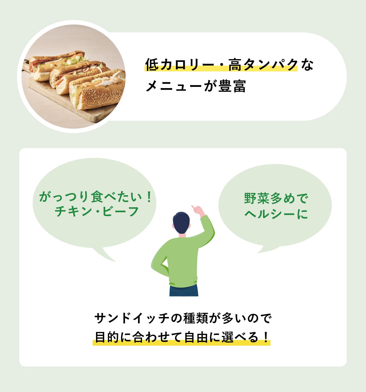 サブウェイはほかのファーストフードチェーンと比較して、低カロリー・高タンパクなメニューが豊富。