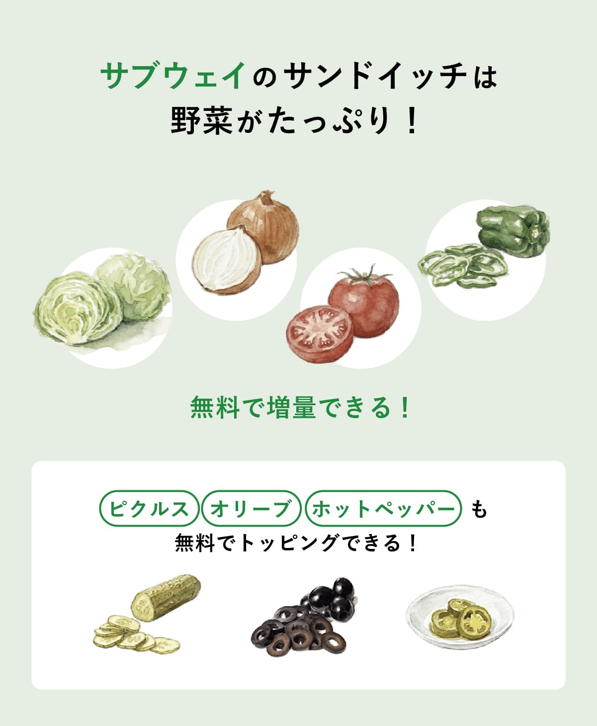 また、「ピクルス」「オリーブ」「ホットペッパー」のアクセント野菜も無料でトッピングが可能。そのため、ほかのファーストフードチェーンよりも野菜をしっかりと摂取でき、栄養バランスも調整しやすいのが特徴。
