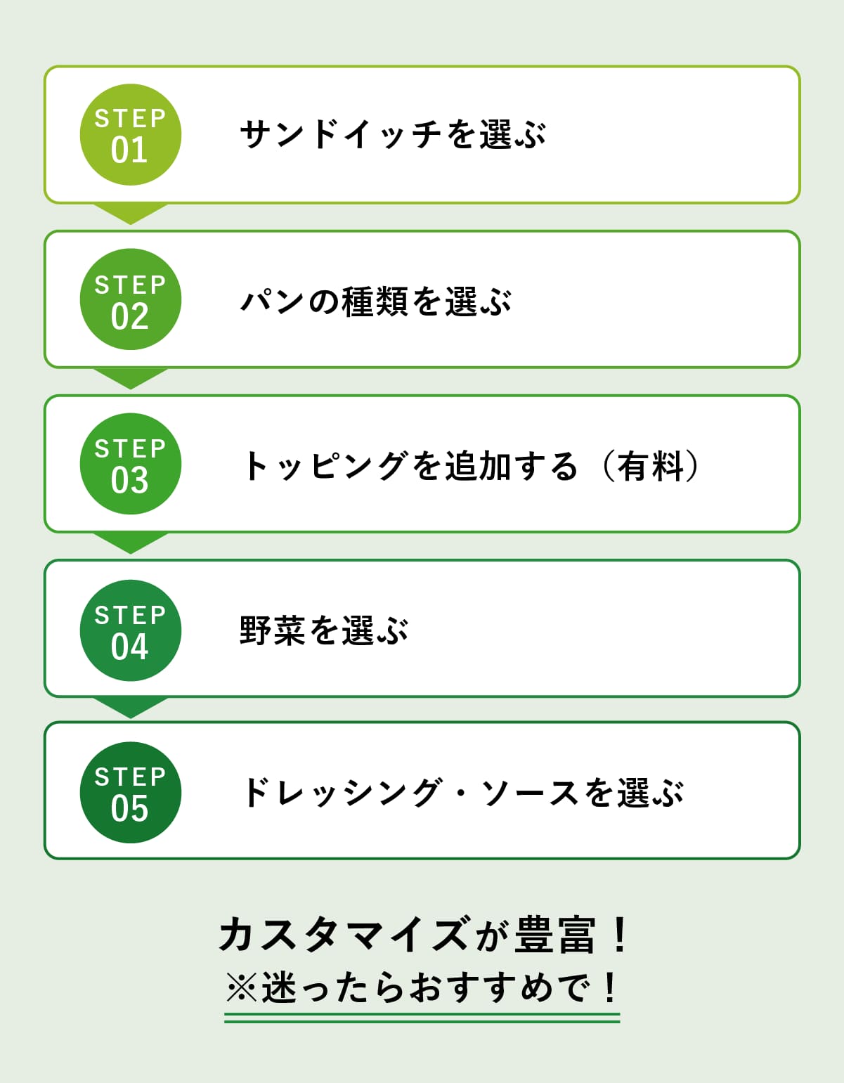 サブウェイの場合、サンドイッチの種類を決めたあとに「パンや野菜の種類」「追加トッピング」や「ソースの種類」を選ぶことができる。パンやソースの種類、野菜の量は無料で調整できるので、その日の気分や目的に合わせて自由にカスタマイズできるのがサブウェイならではの大きな魅力。