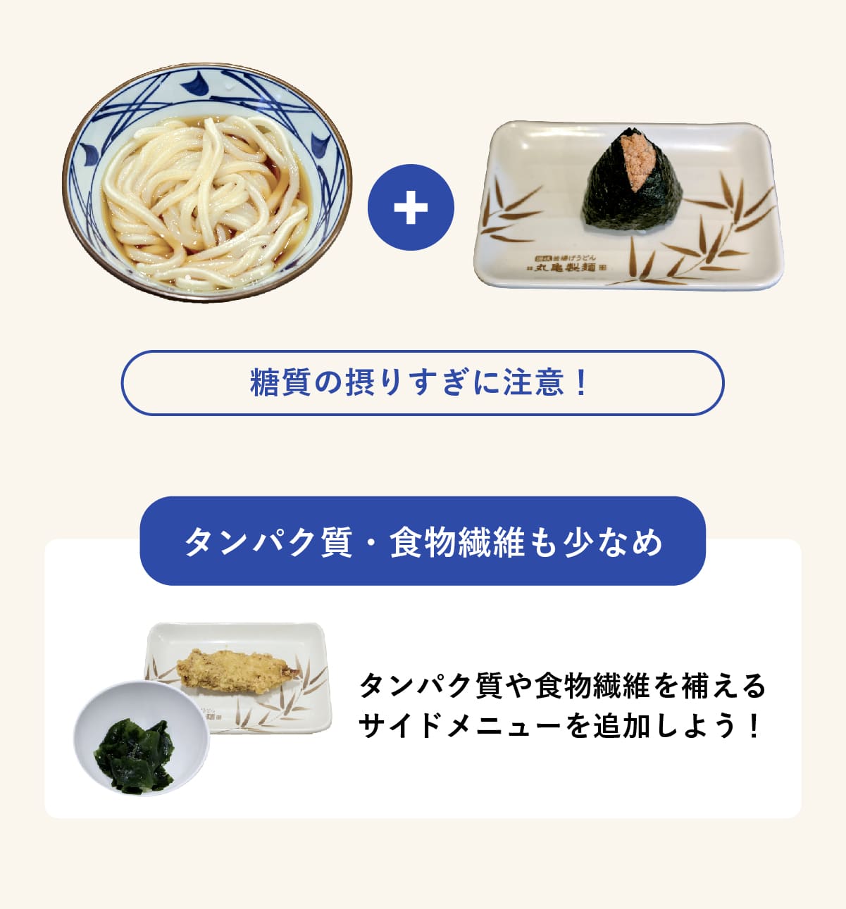 うどんは糖質の割合が多く、おにぎりと一緒に食べると糖質過多になりやすい。