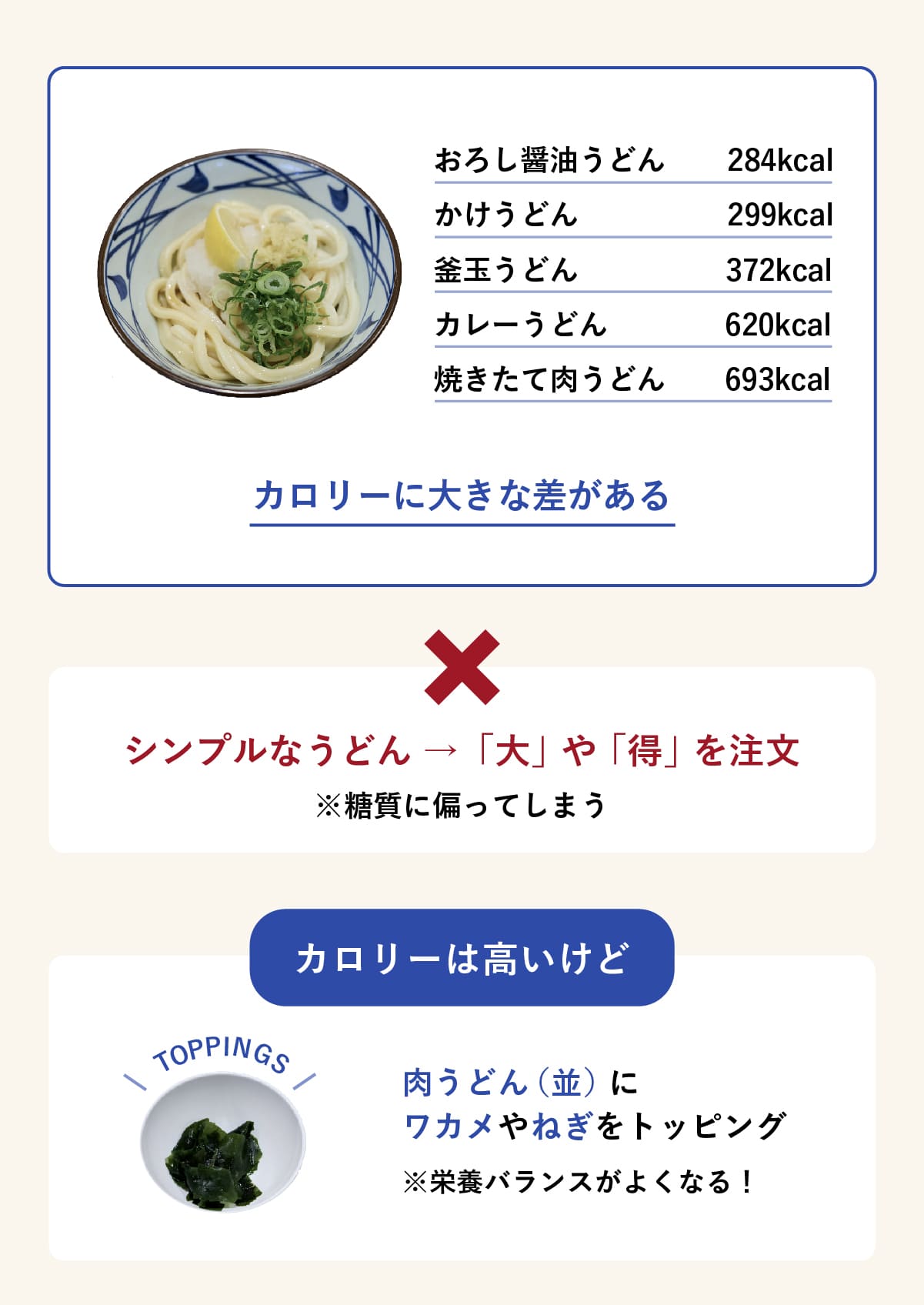 ただし、カレーうどんや肉ぶっかけうどん、野菜かき揚げなどのメニューは高カロリー・高塩分になりやすいので、トータルで管理することが重要。