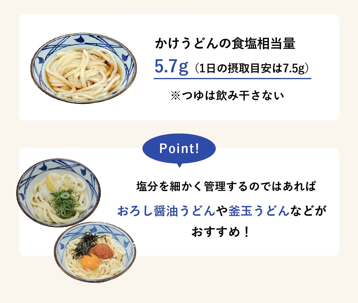 かけうどんやぶっかけなどのメニューは、つゆを飲み干すと塩分が高くなるので、その点も気をつけたほうがさそうです。