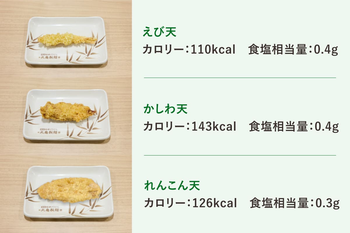 【満足度をプラスできる一品】 うどんにプラスすることで、タンパク質や食物繊維を追加できる天ぷらや、カロリーが低くてもしっかりと食感や満足感をプラスできるトッピングを選定。 |