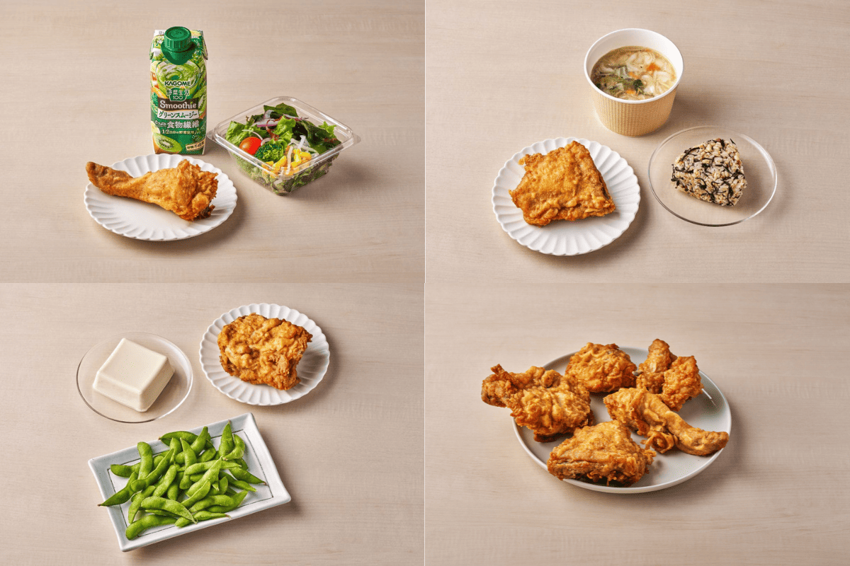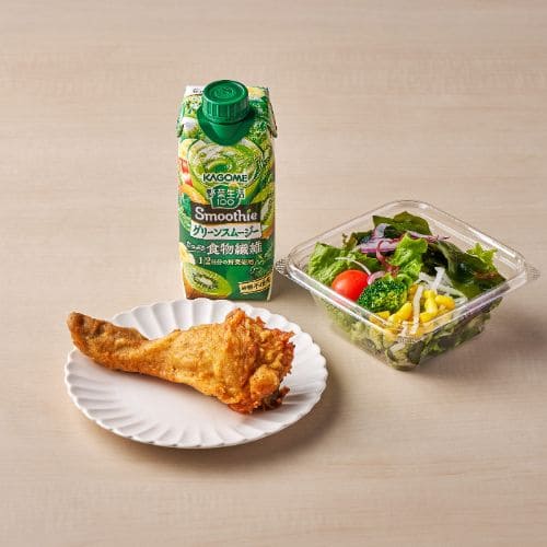 揚げ物を食べるときは、「何を足すか」で食後の体感が大きく変わることがわかっています。チキン1ピースでたんぱく質を確保しつつ、サラダとスムージーで食物繊維・カリウム・水分を補うことで、脂質や塩分の影響を受けにくい内容にすることもできるのです!