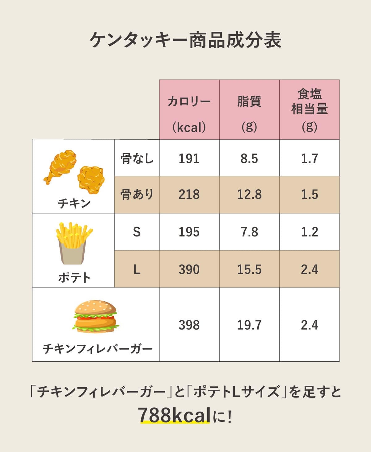 とはいえ、炭水化物・脂質・食塩などは高めなので、チキンと一緒に食べるのは避けよう。