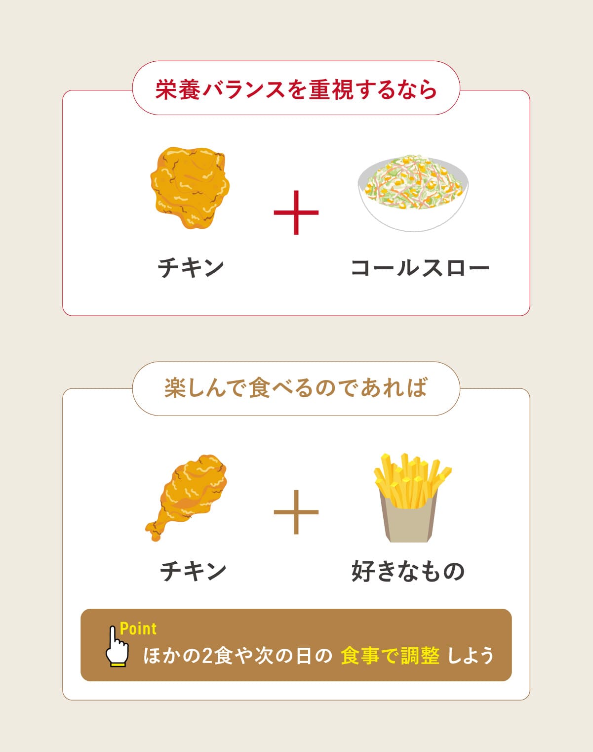また、ケンタッキーは栄養素が偏りやすいので、食べる場合は「ほかの2食は揚げ物を控える」「野菜をしっかり摂る」といった栄養バランスの調整が重要。