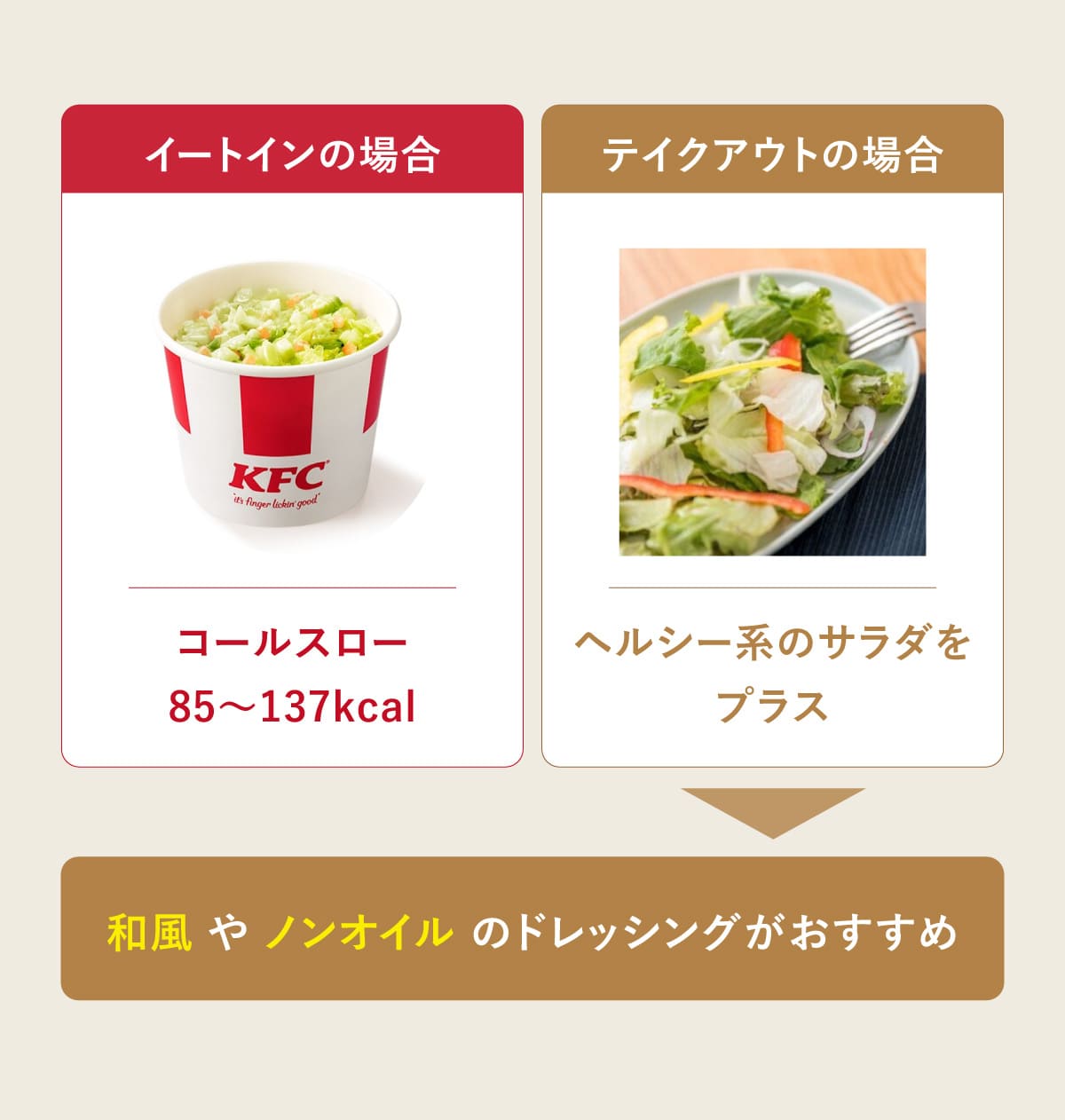ただし、ドレッシングと野菜が混ざっているので、サラダにしてはやや脂質や塩分は高め。ケンタッキーをテイクアウトする場合は、別のお店でサラダを買って、ドレッシングは和風やノンオイルなどのヘルシーなものにするのも1つの方法。