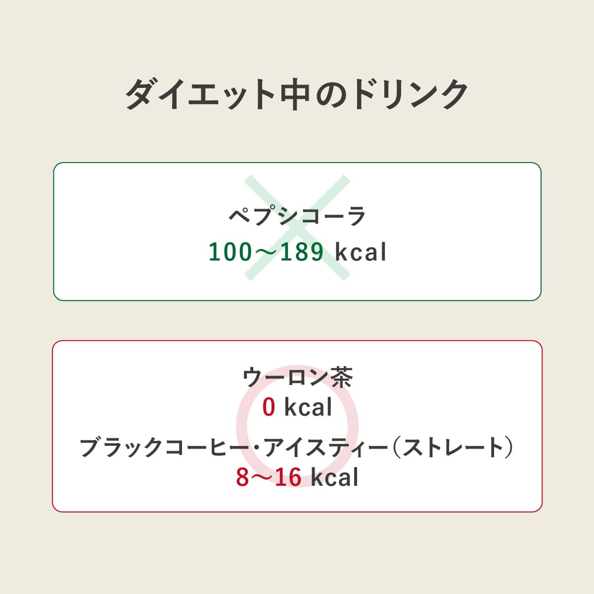 メインのセットドリンクのペプシコーラはS100kcal〜L189kcalと高カロリー。ドリンクを頼むのであれば、ウーロン茶・コーヒー・紅茶などのカロリーが低いものをチョイスしよう。