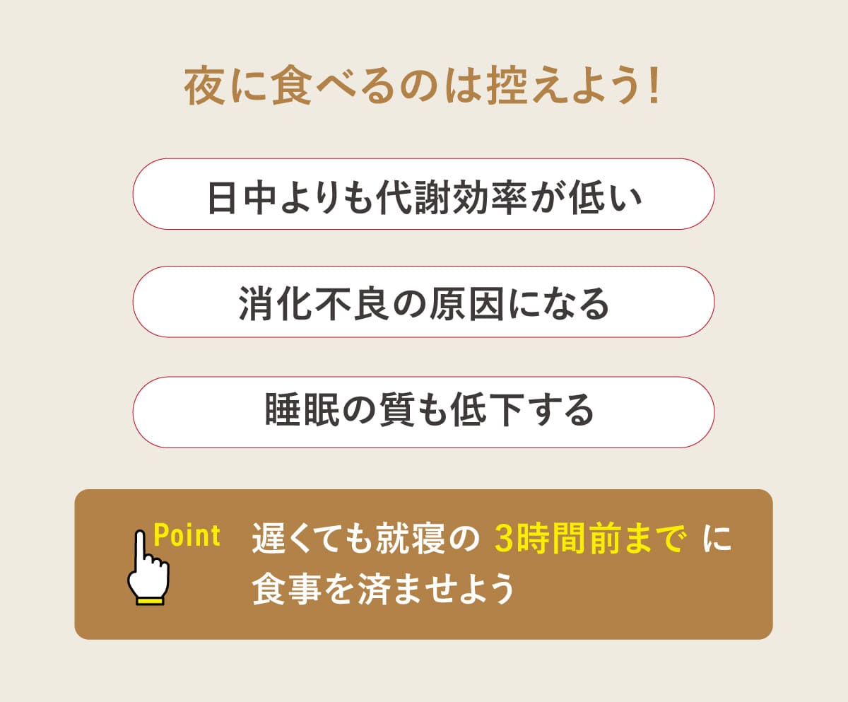 夜は朝・昼に比べて代謝効率が低下するため、夜遅くに食べると胃の中に残ってしまい、消化不良や睡眠の質の低下、翌朝のダルさにもつながる。