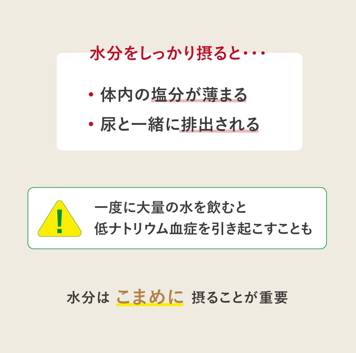 体内の塩分を薄めるためには、しっかりと水を飲むことが大切。水分の余剰分は尿として排出され、このときに塩分も外に出すことができる。