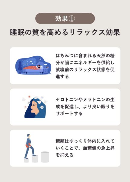 寝る前にはちみつを摂取するとリラックス効果が期待でき、睡眠の質を高めることができる。はちみつに含まれる天然の糖分が脳にエネルギーを供給し、就寝前のリラックス状態を促進する。