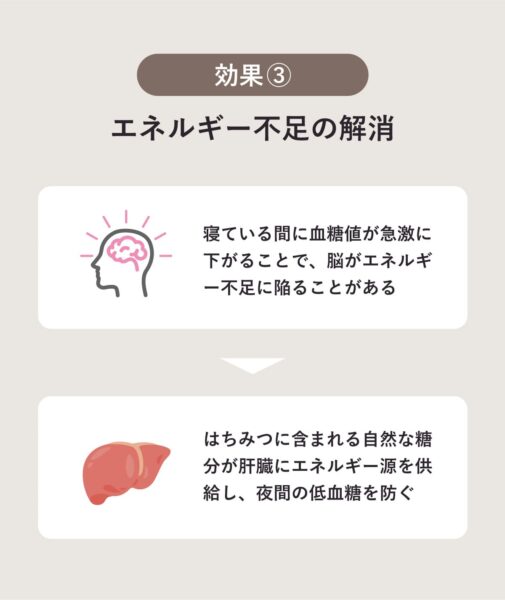 その際にはちみつに含まれる自然な糖分が肝臓にエネルギー源を供給し、夜間の低血糖を防ぐ。これにより、脳のエネルギー不足を解消し、睡眠中の覚醒を防ぐ。はちみつは血糖値の急激な変動を抑えることから、安定した睡眠を得るためにも効果的。