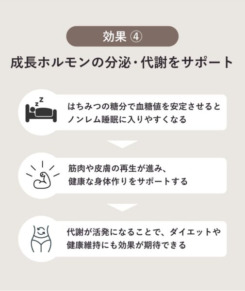 ノンレム睡眠のときに分泌される成長ホルモンは、身体の修復や成長を促進する重要なホルモン。はちみつの糖分で血糖値を安定させるとノンレム睡眠に入りやすくなる。