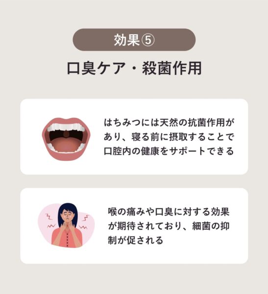 はちみつは喉の痛みや口臭に対する効果が期待されており、細菌の抑制が促される。とくにティートリーから採れたマヌカハニーは、殺菌能力が強い。