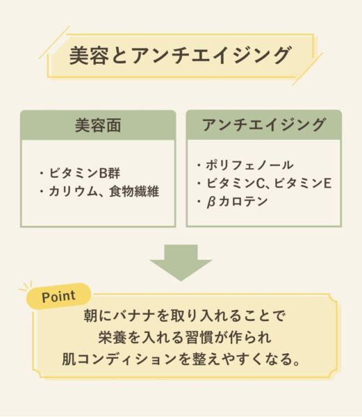 美容面でのメリットは「朝に栄養を整えて摂れること」。バナナにはビタミンB群やカリウム、食物繊維が含まれており、朝食の土台を作りやすい。