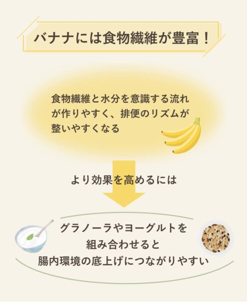 より効果を高めたい場合は、バナナだけで済ませるよりグラノーラやヨーグルトを組み合わせると、腸内環境の底上げにつながりやすい。