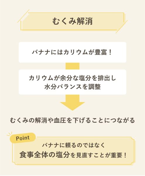 バナナに含まれるカリウムは、体内の余分な塩分(ナトリウム)を排出し、水分バランスを調整する効果が期待できる。塩分が排出されると、むくみの解消や血圧を下げることにつながる。
