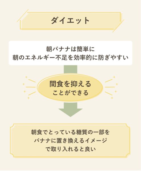 ただし、通常の朝食にバナナをプラスするだけでは、カロリーが増えてしまうので、朝食でとっている糖質の一部をバナナに置き換えるイメージで取り入れるとよい。