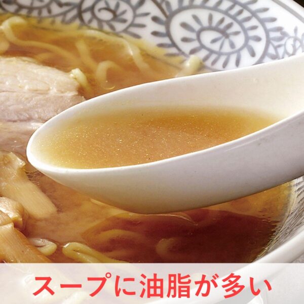 醤油系は脂質の量を見た目でも判断しやすいです。スープ表面の油膜が薄いものほど脂質量は軽く、味わいもすっきりとします。ただし、塩分はしっかり含まれるので、スープの完飲は避けるのが基本です。