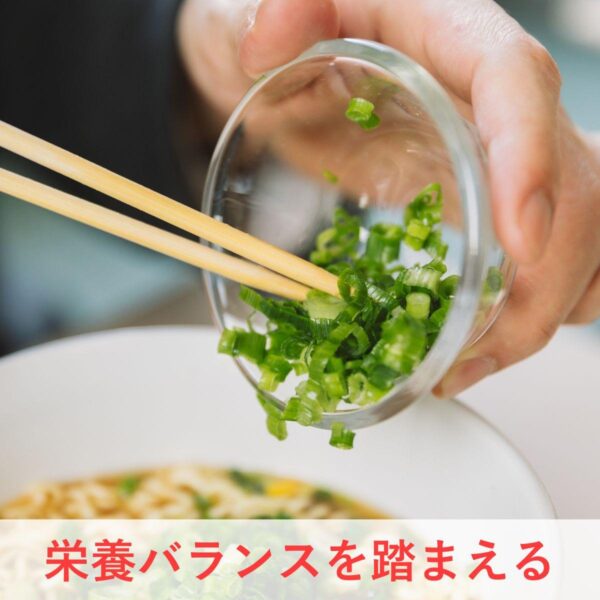 自分で作る分、脂質をコントロールしたり具材追加で栄養バランスを整えたりしやすいのが魅力です。ゆで野菜や卵、海藻を足すとバランスが良くなります。逆にチャーシューやバター、炒め野菜を追加するとカロリーはすぐ増えるので、目的によってトッピングを選びましょう。