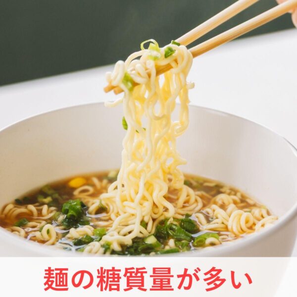 ラーメンの麺は小麦粉が主原料で、糖質量が多い点が特徴。一般的な1杯あたりの糖質量は約60〜80gで、これだけで約240〜320kcalを占める計算となる。