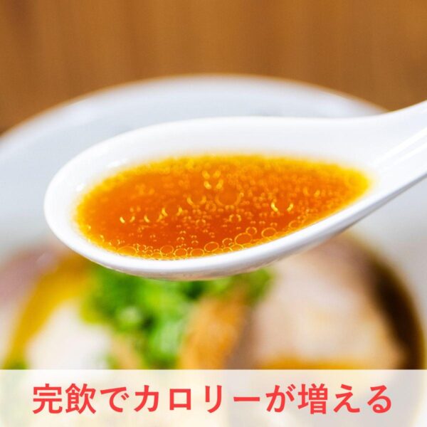 ラーメンのスープには脂質と塩分が多く、完飲するかどうかでラーメン1食におけるカロリー摂取量は変わる。