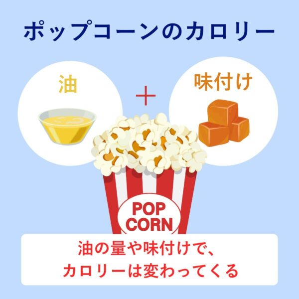 ポップコーンは味付けの違いでカロリーは大きく変わります。あくまでおやつとして適切な量を食べ、カロリーのとりすぎに注意しましょう。