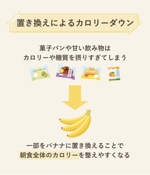 朝食が菓子パンや甘い飲み物中心になると、気づかないうちにカロリーや糖質を摂りすぎてしまうことがある。その一部をバナナに置き換えることで、糖質量や脂質量を見直しやすくなり、朝食全体のカロリーを整えやすくなる。