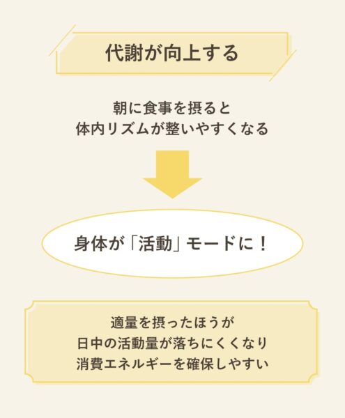 朝に食事を摂ると体内リズムが整いやすくなり、身体が「活動モード」に切り替わりやすくなる。