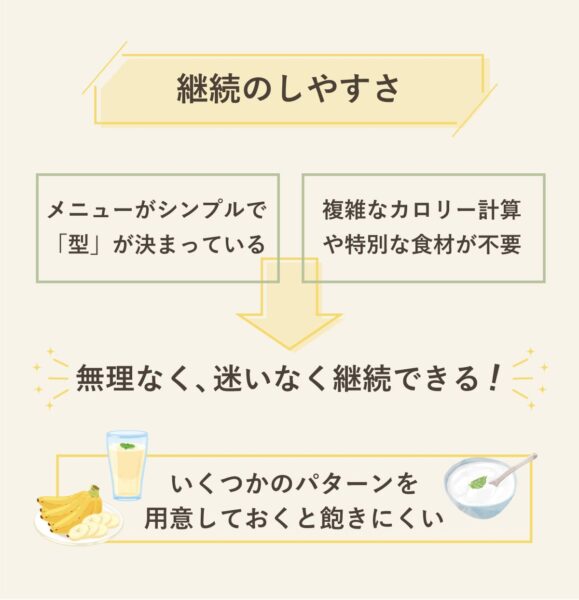 朝バナナダイエットは、メニューがシンプルで「型」が決まっているため、迷いが少なく続けやすいのが特徴。