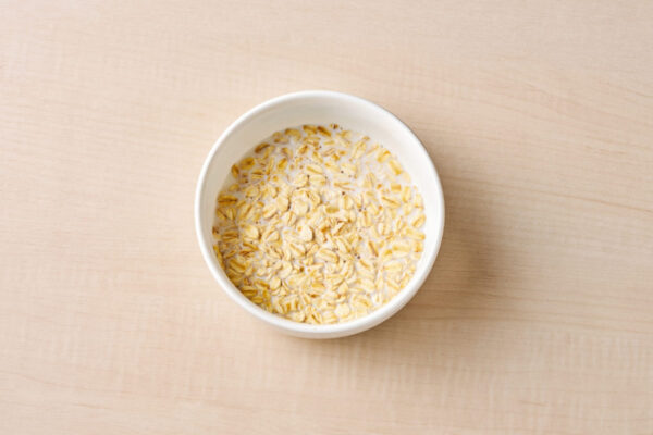 ①耐熱容器にオートミールと牛乳を入れる。 |