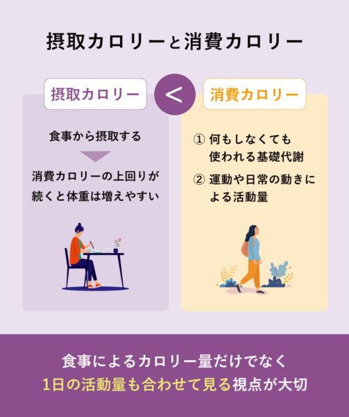 体重の増減は、摂取カロリーと消費カロリーのバランスによって決まる。自分にとって必要なカロリーを知り、少しずつ整えることが体重管理の基本。