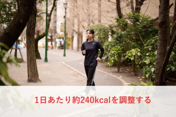体重1kgを減らすには、約7,200kcalのエネルギー不足が必要といわれている。1ヵ月で1kg減らすなら、1日あたり約240kcalを調整する計算となる。