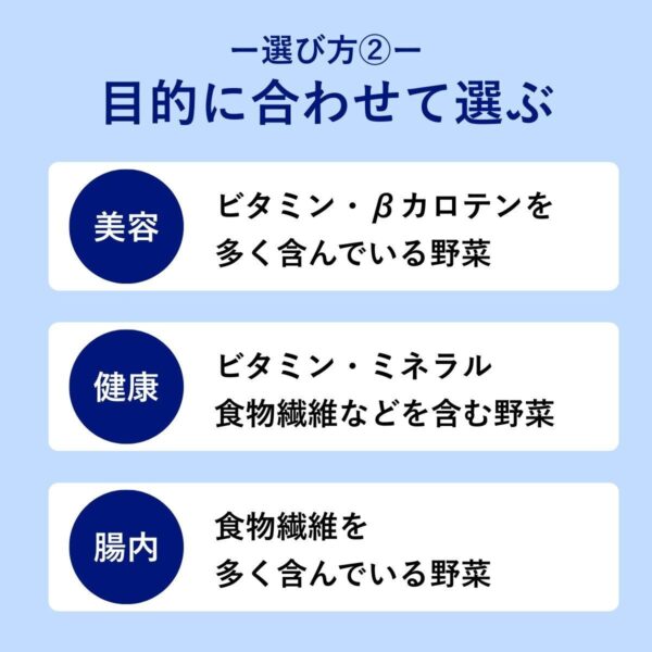 - 摂取量と頻度が確保できる野菜を選ぶ