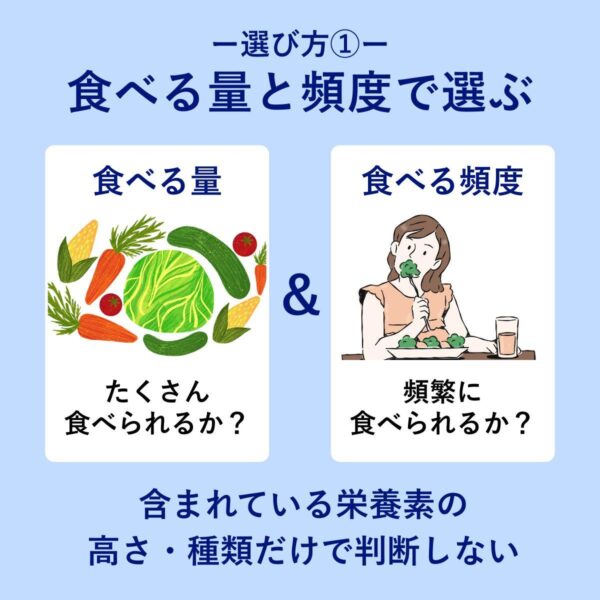 ただし、単一の栄養素の量だけを見るのではなく、複数のビタミン・ミネラル・食物繊維をバランスよく補えるかという視点も欠かせない。栄養素の種類と組み合わせやすさまで含めて判断することが重要になる。