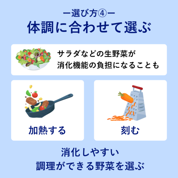 「体に良いから」と無理に食べるのではなく、その時の体調に合わせて形や調理法を調整できる野菜を選ぶことは、野菜の栄養素を上手に摂取する方法として有効。