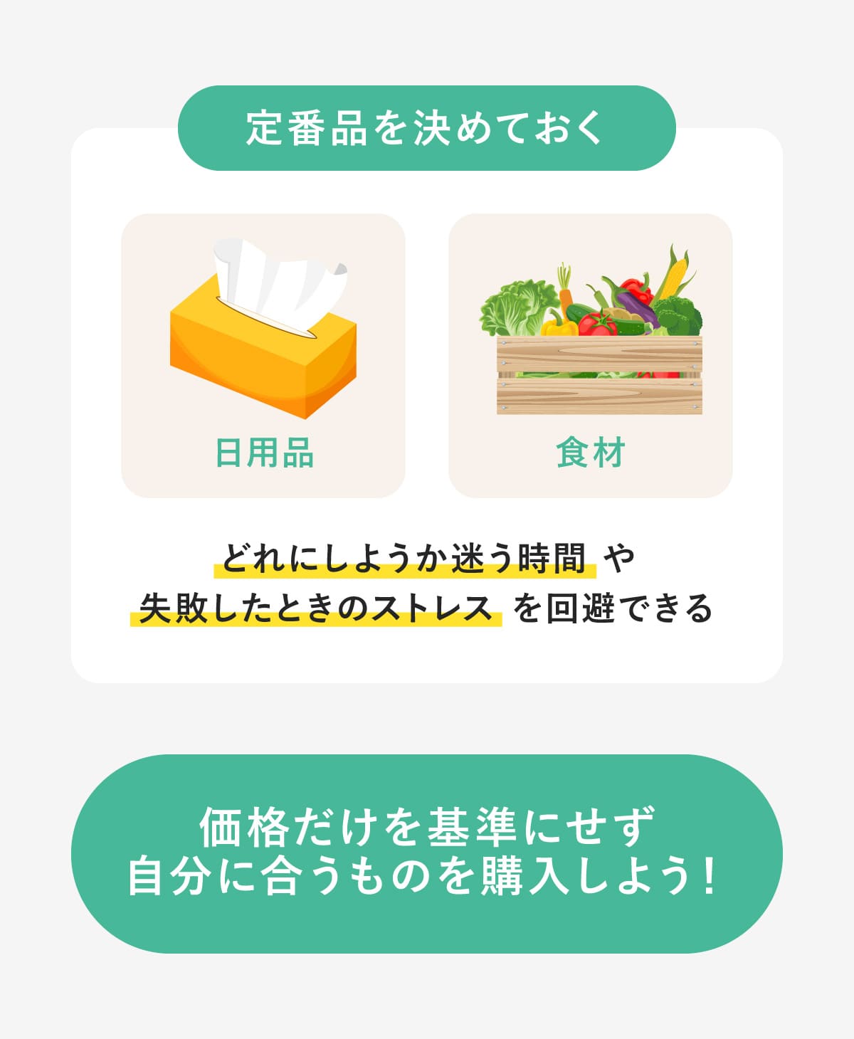 たとえば、物を選ぶときに価格だけを基準にせず、自分に合った硬さの歯ブラシや使い勝手のよいトイレットペーパーやラップを選ぶなど、普段の生活で使用するイメージを持つことが大切。また、毎日使う物ほど定番品を決めておくことで、どれにしようか迷う時間や失敗した際の落胆などちょっとしたストレスを回避でき、時間の節約にもなる。