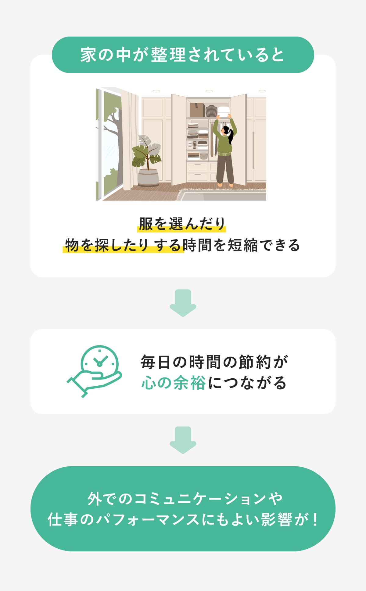 家の中で丁寧に暮らすことができれば、職場や友人との食事など、外での活動にもその姿勢が表れるようになる。たとえば、家の中が整理整頓されている状態だと、服を選んだり物を探したりする時間を短縮することができる。