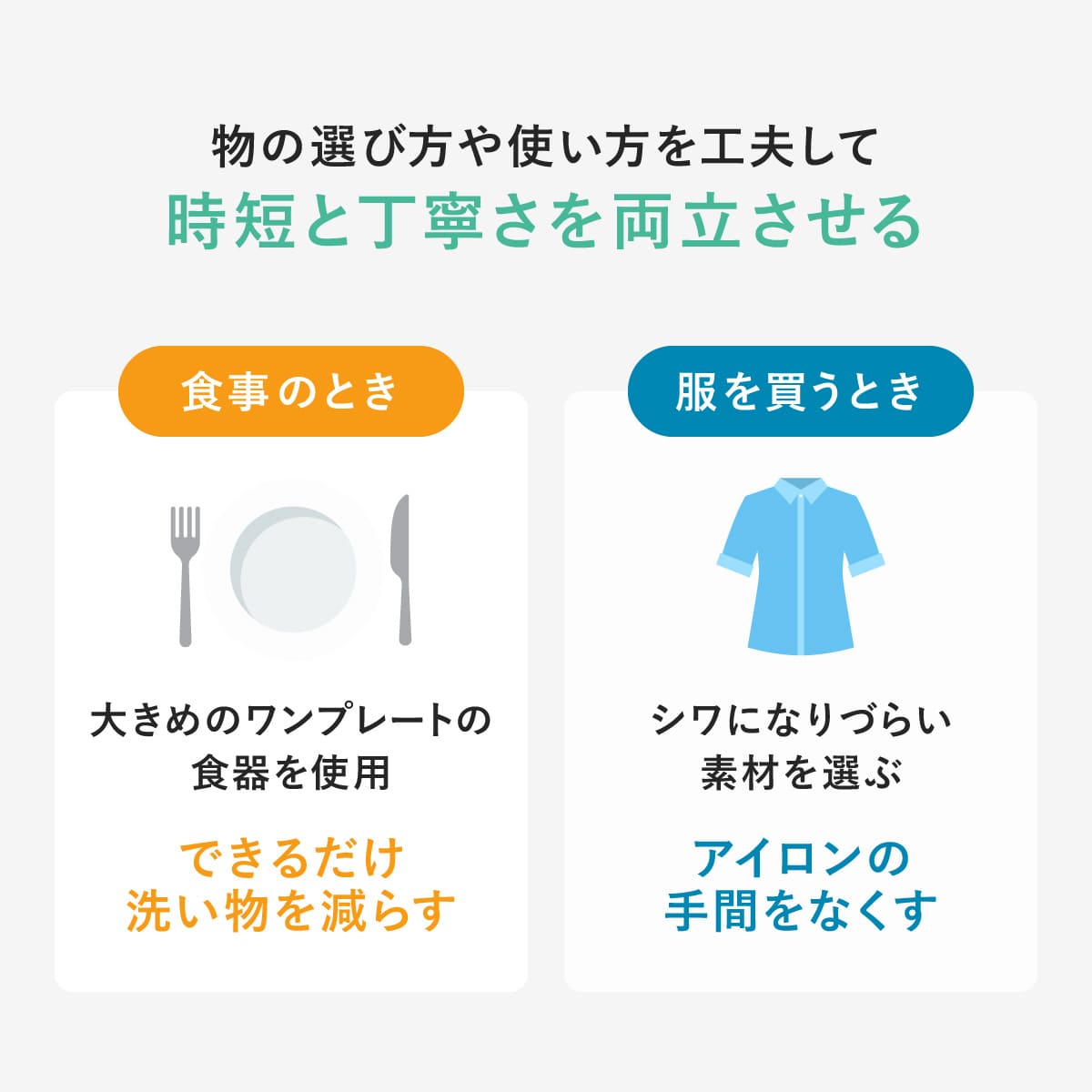 そのため、物の選び方や使い方を工夫して「時間の短縮と丁寧さを両立させる」ことが大切。
