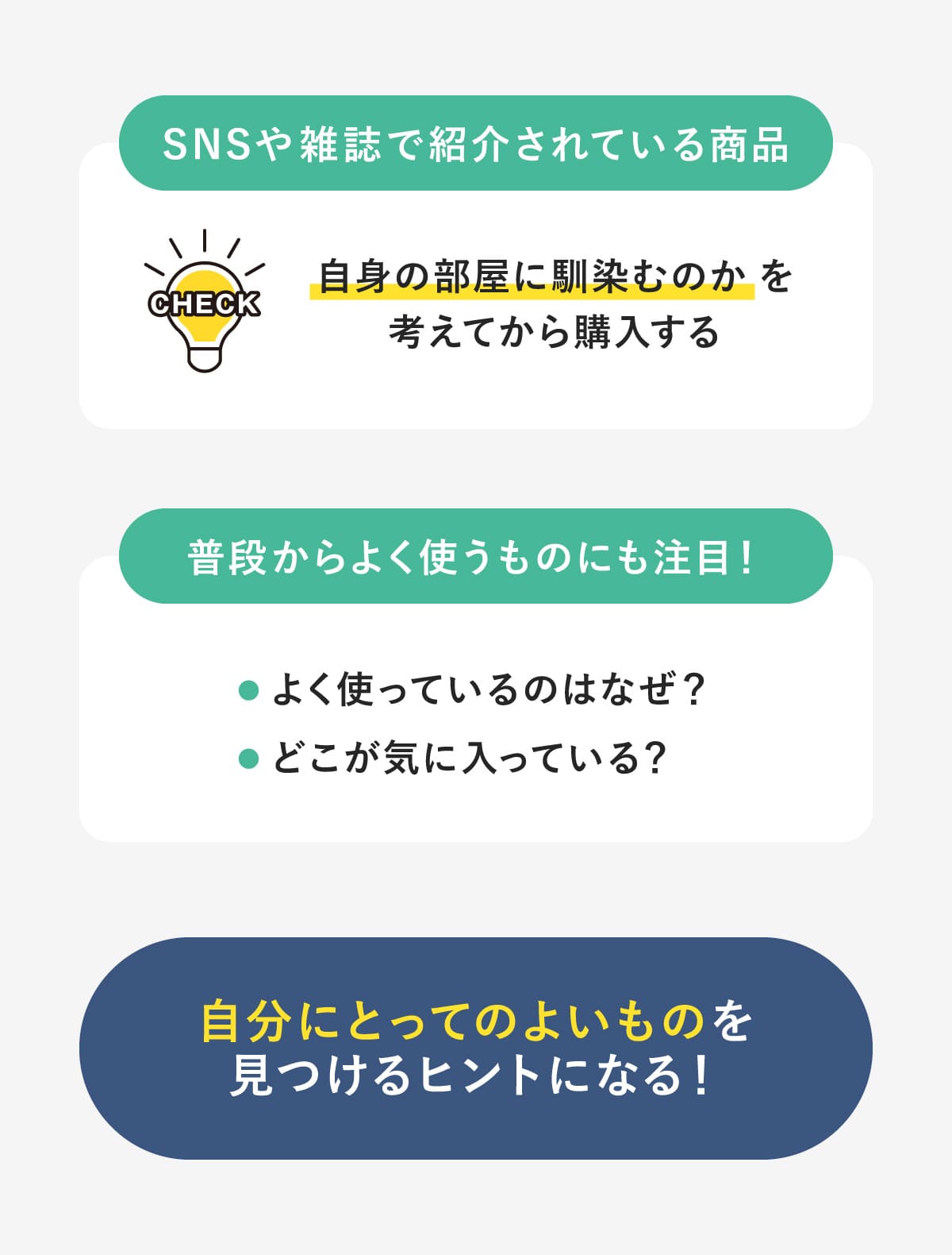よい物を見つけるのに、SNSや雑誌で情報収集をすることは大切だが、インテリア雑貨の場合、空間としてデザインされていることがほとんどなので、いざ買ってみたら自分の部屋には馴染まないことがある。自分にとってのお気に入りを見つけるヒントは、「日常生活でよく使用している物」に注目すること。