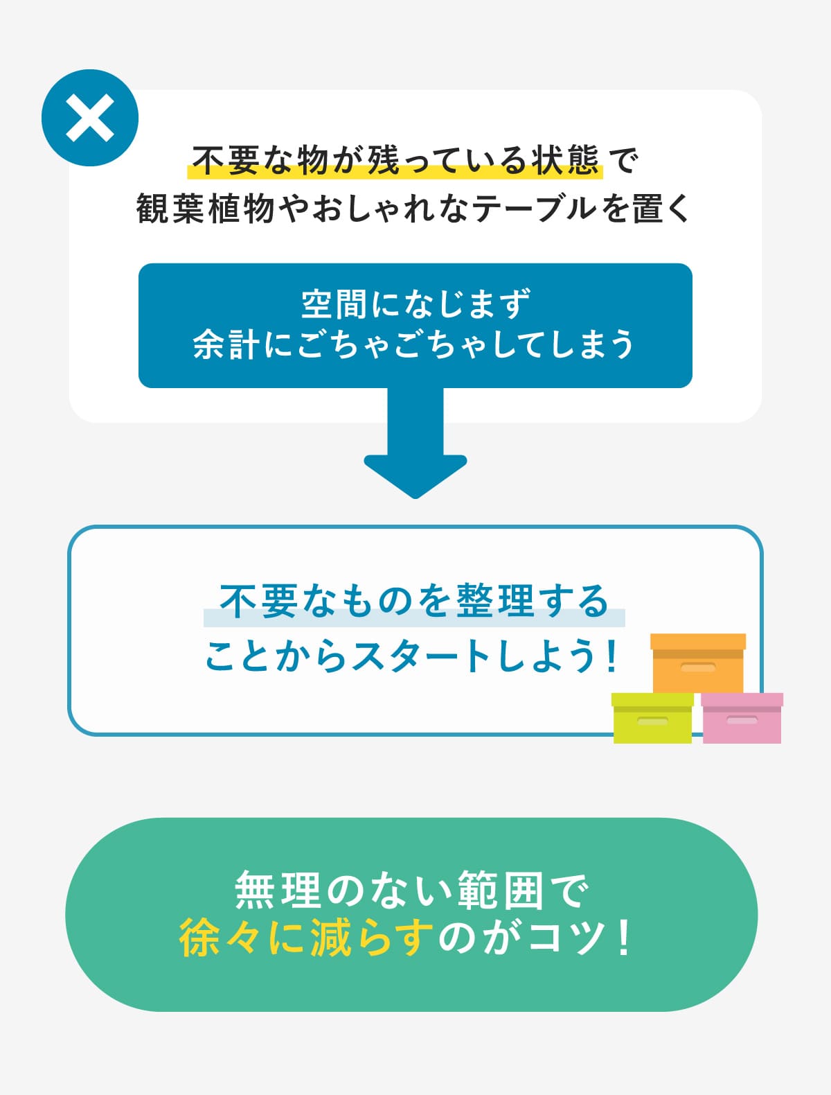整理整頓されていない状態で観葉植物やおしゃれなテーブルを置いても、空間になじまず、余計にごちゃごちゃしてしまう可能性が高い。そのため、まずは無理のない範囲で物を整理することから始めよう。一気に減らすと「生活が不便になって、結局買い直す」といった手間が発生するので、時間をかけて整理するほうが長続きしやすい。
