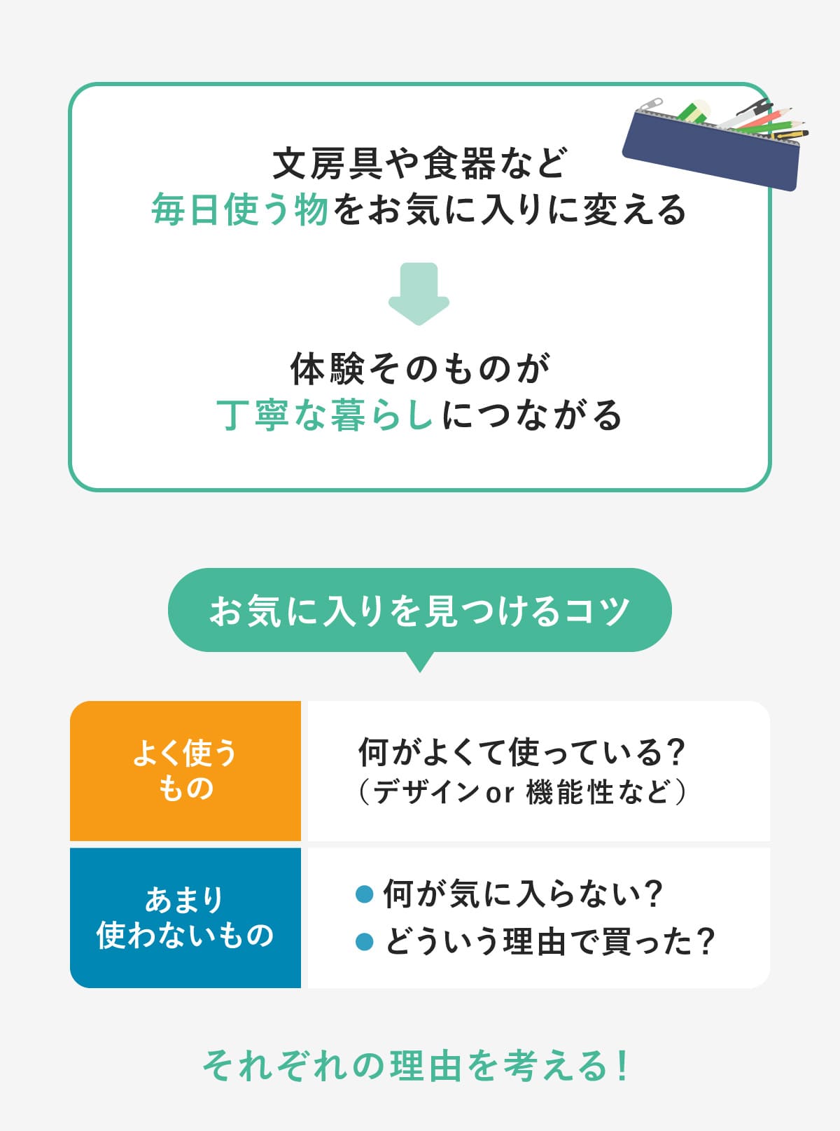たとえば、お気に入りの食器や文房具を使うことで、自然とそれらを大切に扱うようになり、「ちゃんと定位置に戻そう」という意識も生まれやすくなる。無理に新しい物を買わなくても、家の中でお気に入りが見つかることも多い。