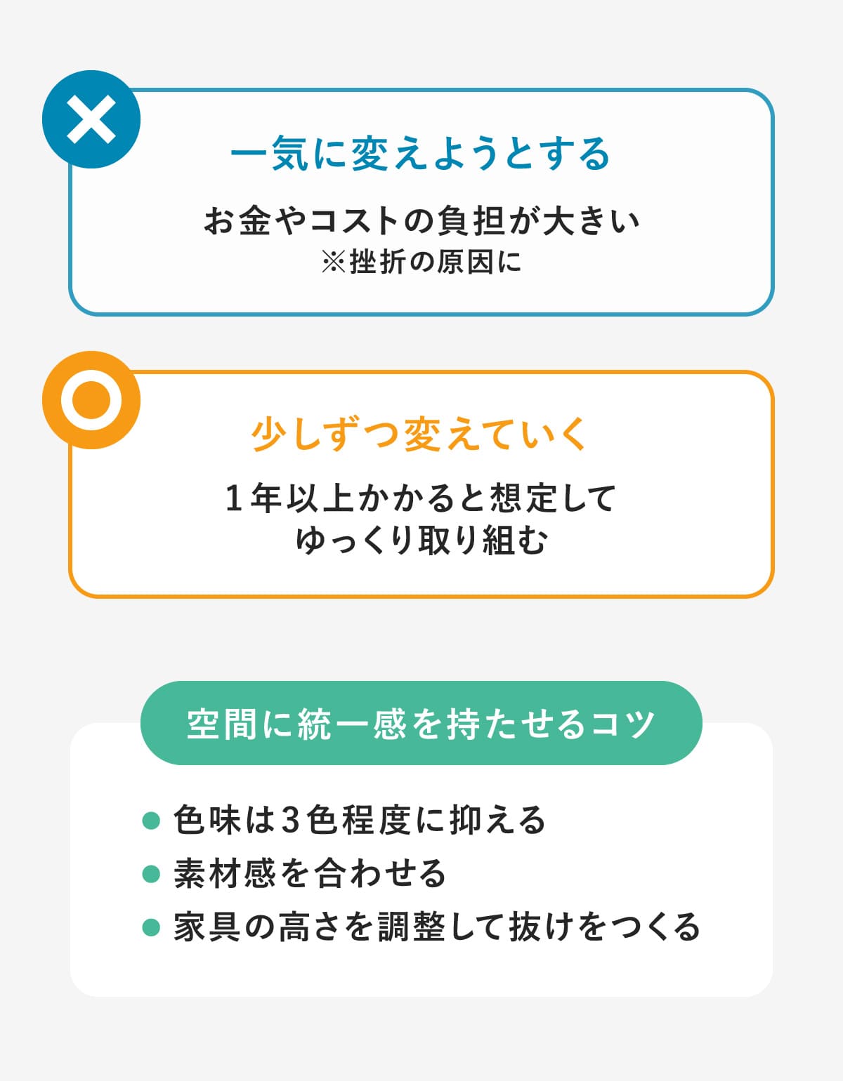 一気に変えようとするとお金や時間などのコストがかかり、途中で挫折しやすくなる。丁寧な暮らしを実現するには1年以上かかると想定したうえで、少しずつ取り組むのがポイント。