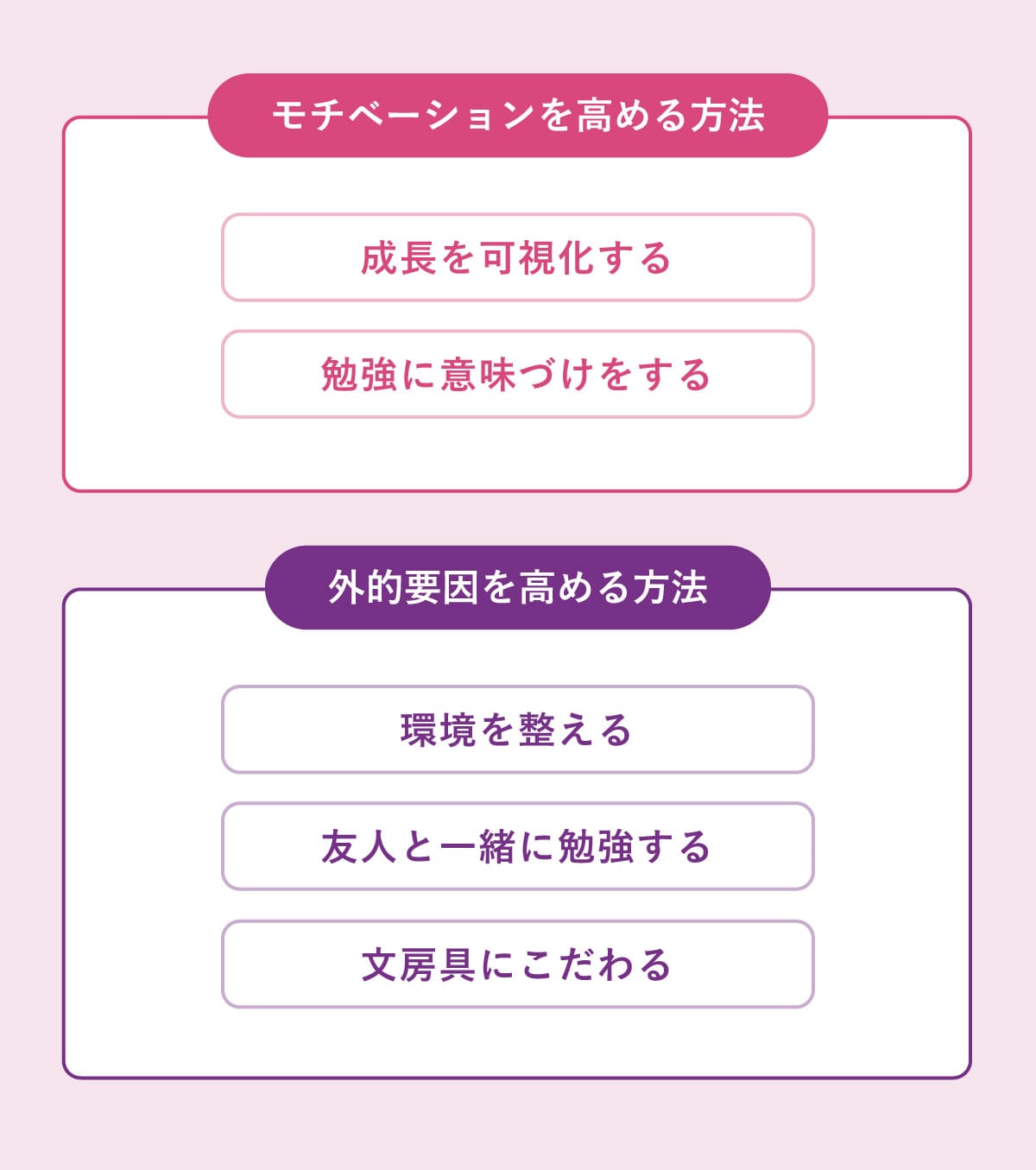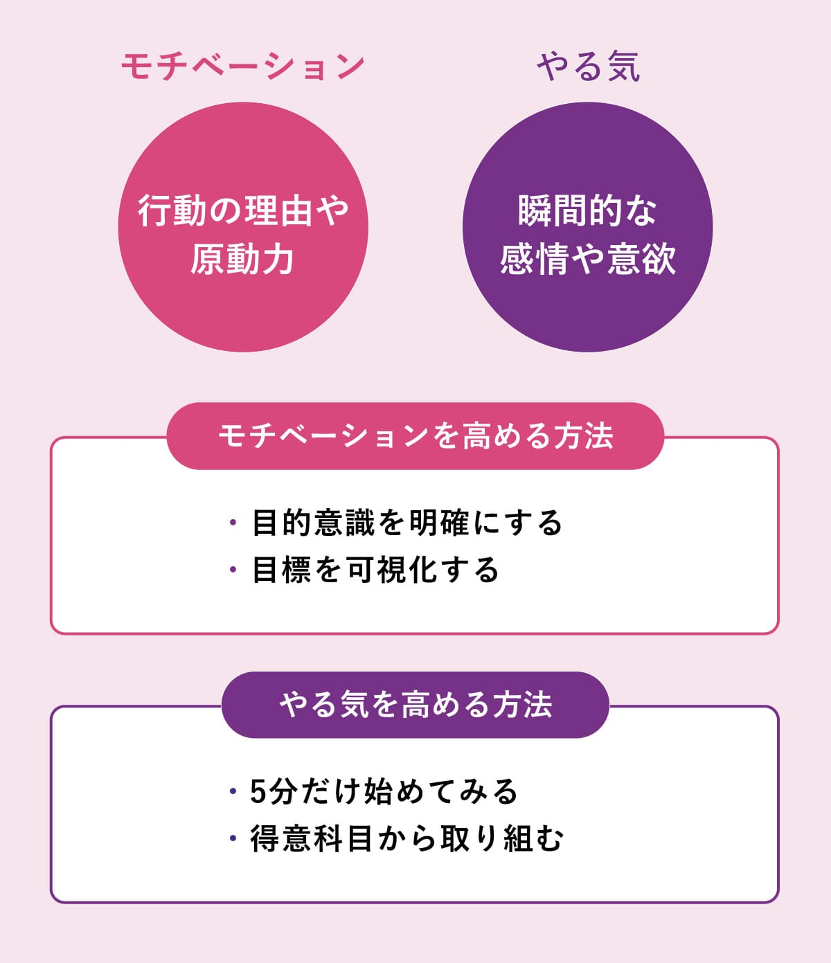 モチベーションを高めたい場合は、目的意識を明確にして、目標を可視化して、自分の内面にアプローチする。やる気を高めたい場合は、5分だけ始めてみる・時間を測って取り組む・得意科目から取り組むなど、前向きになれる行動を取り入れる。