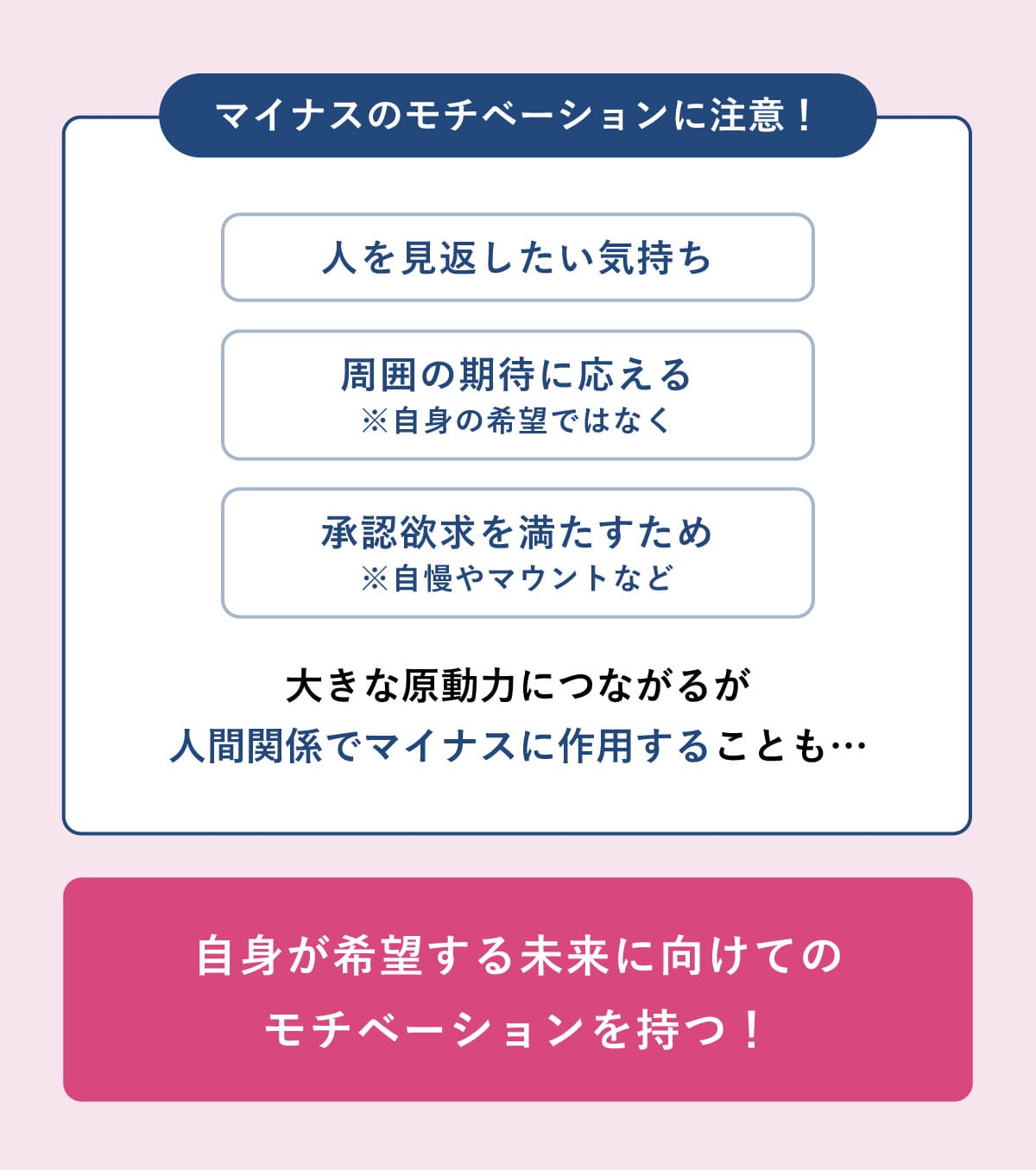 「人を見返したい気持ち」「承認欲求を満たすため」「自身の希望からではなく周囲からの期待に応えるため」といったマイナスのモチベーションは、大きな原動力につながるが、人間関係においてマイナスに作用することもあるので注意が必要。マイナスの動機ではなく、自身が希望する明るい未来に向けてモチベーションを持つことが大切。